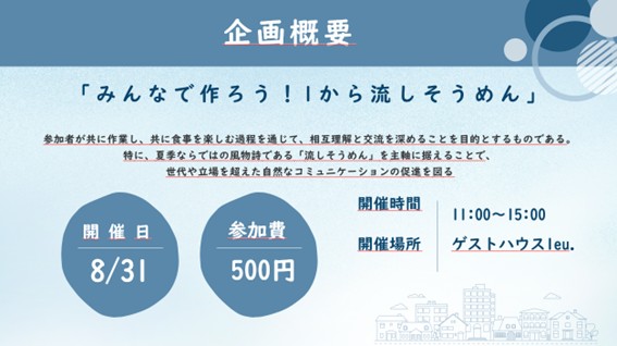 特に、夏季ならではの風物詩である「流しそうめん」を主軸に据えることで、世代や立場を超えた自然なコミュニケーションの促進を図りたいと考えました。