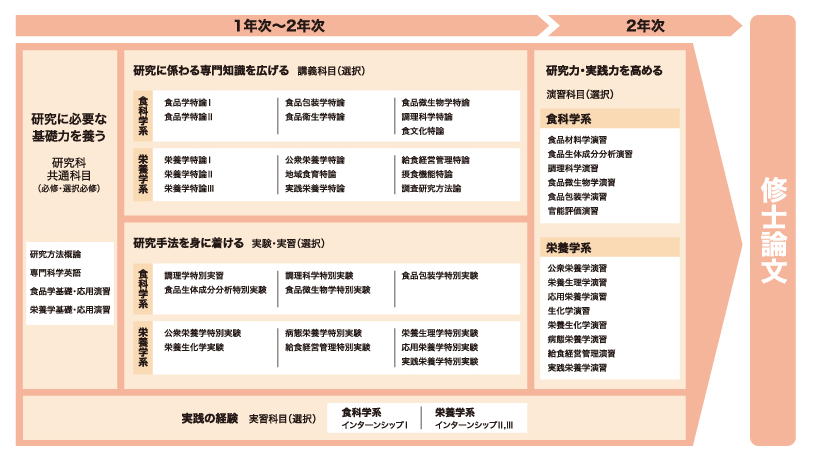 食品、調理、栄養に関わる諸科学の豊かな学識を深めるとともに高度の研究能力を培います。 それらを用いて、食と栄養に関わる諸問題の解決に応用し、国際的に活躍できる人材を養成します。 高度で十分な学識と技術を身に付け、食と栄養に関する諸問題の解決方法を多角的・専門的に計画、提案、実践できる能力の修得を目的とします。