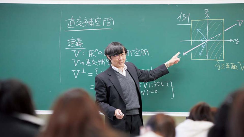 1年次後期に行う「線形代数学ⅡA」の授業は、 座標を斜めに取り直す変数変換で式を簡単にする技術を学ぶものです。 二つ以上の変数を扱うすべての問題に応用でき、もう少し高度な数学を学ぶと線形代数は一変数の問題にも応用されます。 統計学にも使われ、ありとあらゆる学問の礎となります。 多くの学生に線形代数学の基本的な計算、勉強する習慣、そして論理的な説明の書き方の初歩を身につけてもらい、問題に相対するときの心構え、試行錯誤の仕方も伝授します。