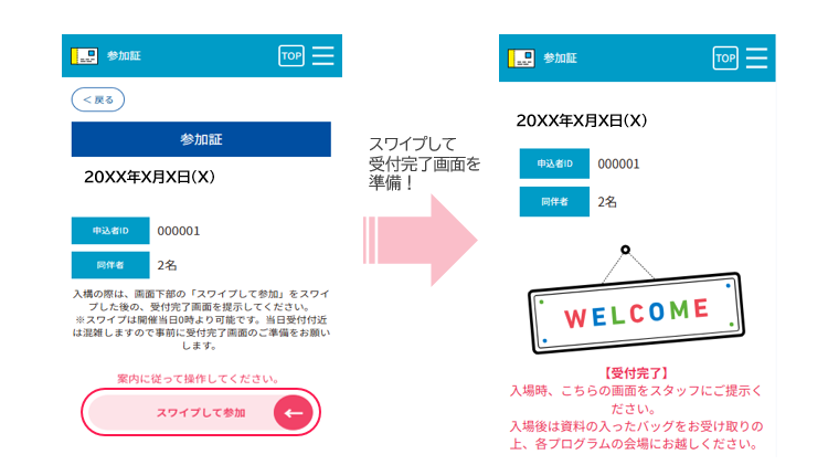 ③ ご入場の際はあらかじめ申込みサイトにログインの上、「参加証」の「スワイプして参加」をスワイプし、受付完了画面をご提示ください。 -