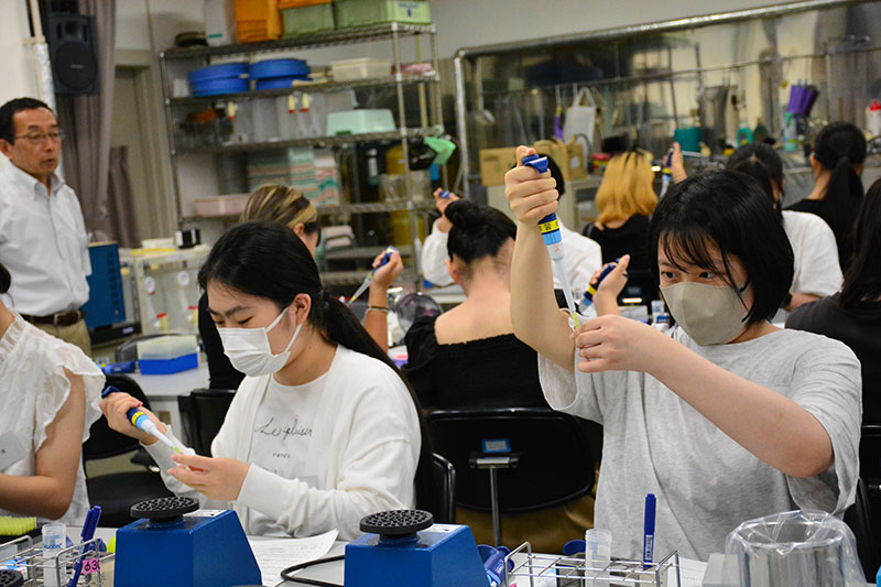 遠方や海外からの参加者も多く、「母が働く研究機関のイベントなどにも参加してきましたが、ピペットマンを使ってこんな本格的な遺伝子導入の実験をしたのは初めてでした。貴重な体験をさせてもらえて勉強になりました」「今、学校でちょうどマイクロリットルの単位について学んでいたので、実際に測ってみることができ、意外と目で見ることができる量なんだ!と新しい発見をすることができました」といった感想が寄せられました。本学では、実物を観るという自然科学を重視した創立当時からの理念が受け継がれ、1年次から実験実習に積極的に取り組んでいます。大学で行われている最先端の研究の一端を感じていただけたのではないでしょうか。