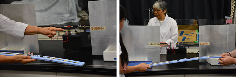 形状によって検出の精度が変わることを実際に体験することができ、「今はこうして簡単に再現ができますが、ヘルツは何度もこのような実験を繰り返し、とても苦労して研究を進めたのですね」という奥村先生の説明に、参加した高校生たちも深くうなずいていました。