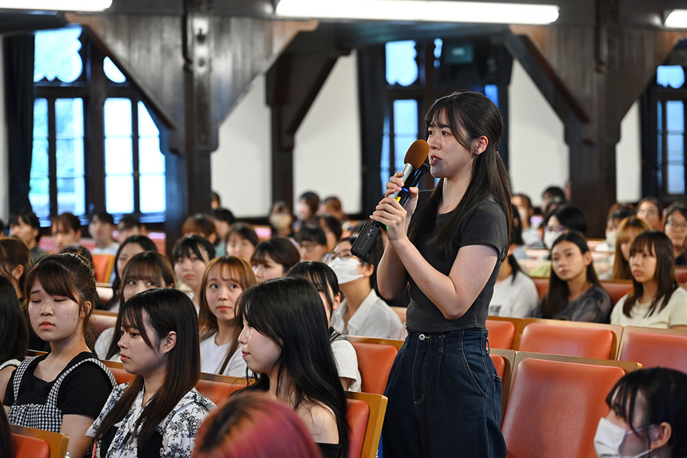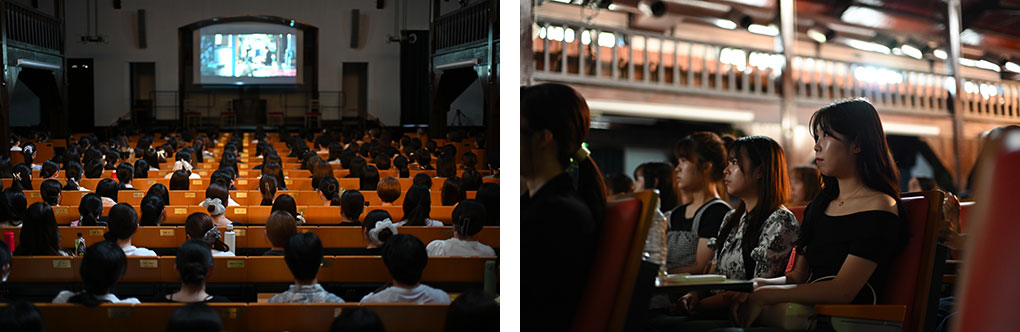 お2人のメッセージ、そして伊藤沙莉さん演じるまじむの姿を受けて、創立125周年を迎える日本女子大学の学生として、凛々しく、堂々と社会に貢献できる人間を目指していきたいと感じました。(文:英文学科3年川口葵衣さん、家政経済学科2年井原咲幸さん)