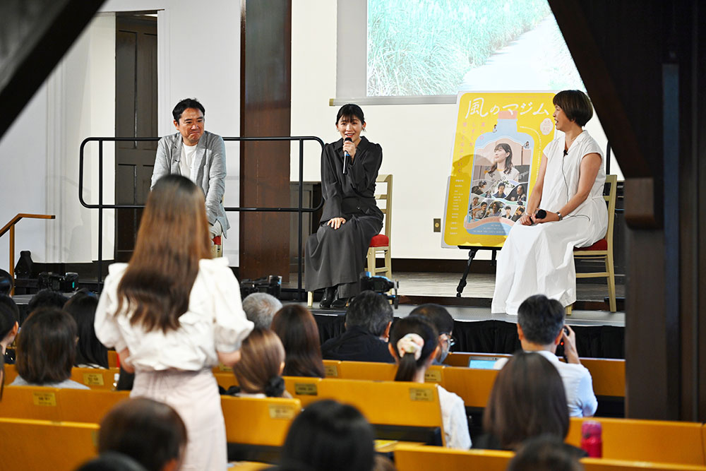 2025年8月28日(木)、日本女子大学成瀬記念講堂にて、2027年に開設が構想されている「経済学部(仮称)」の前身である「家政経済学科」の学生を中心に、他学科を含む300名以上の学生を対象に夏期特別教室「風のマジム」映画試写会が開催されました。試写会後のトークショーでは、主演の伊藤沙莉さんと原作者の原田マハさんに登壇いただきました。今回は、その様子を私たちJWU PRアンバサダーの潜入レポートとしてお届けします。伊藤沙莉さんと原田マハさんに特別にお時間をいただき、インタビューもさせていただきました。
