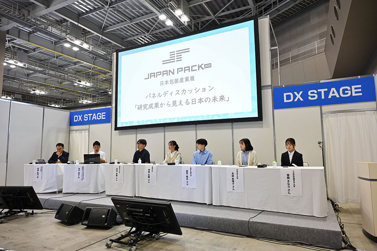 10月7日(火)から10月10日(金)まで4日間、東京ビックサイトで「JAPAN PACK 2025 ~日本包装産業展~」が開催されました。JAPAN PACKは1964年に初開催された「日本包装機械展」にルーツを持ち、包装産業に関わる最新鋭の製品・技術・サービスが一堂に会するイベントです。その会期中の10月9日(木)に行われたステージイベント「パネルディスカッション『研究成果から見える日本の未来』」に、日本女子大学家政学研究科食物・栄養学専攻修士1年の太田眞唯子(おおたまゆこ)さんが登壇しました。
