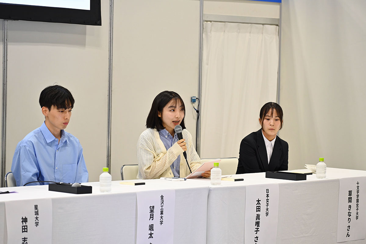 このイベントには、太田さんのほか、金沢工業大学、星城大学、十文字学園女子大学、愛知県立大学から学生・大学院生が登壇。5名の学生が「人との暮らし」(超高齢化社会・労働力不足・ウェルビーイング)と「地球の未来」(サステナビリティ・地球環境問題)の2つのテーマから、日本の未来に包装業界がどう貢献できるのか、そして包装の魅力や新たな価値について、意見を交わしました。