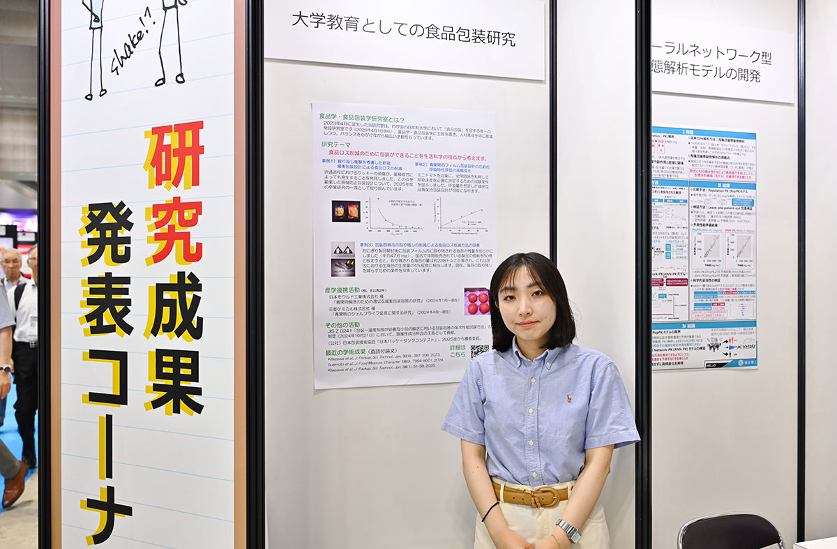 多くの方に興味を持っていただき、研究内容について詳しく質問してくださる方もいらっしゃいました。国内4年制大学で唯一の食品包装学研究室に所属していることにも関心を寄せていただいたように感じます。