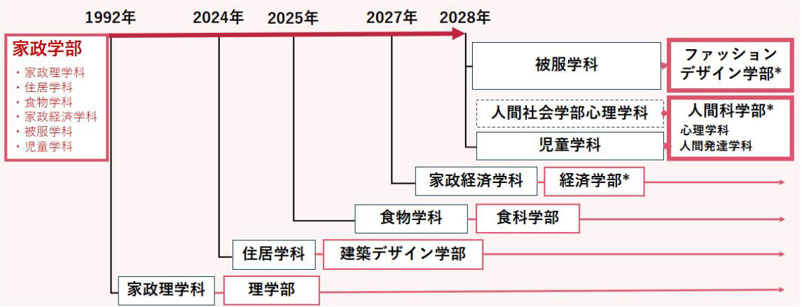 「株分け」のスタートは、1992年に「家政理学科」を私立女子大学として唯一の「理学部」へと学部化したことに始まります。その後、「住居学科」が「建築デザイン学部」として独立し、「食物学科」は「食科学部」となりました。さらに2027年度には「家政経済学科」が「経済学部(仮称)」、2028年度には「被服学科」が「ファッションデザイン学部(仮称)」、「児童学科」が「人間社会学部心理学科」とともに「人間科学部(仮称)」となり、120年以上続いた「家政学部」は幕を降ろす予定です。