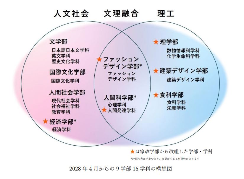 日本女子大学は女子総合大学における「家政学部」の発展的改組をもとに、2028年度には人文社会・理工・文理融合の3領域、9学部16学科体制が実現する構想です。