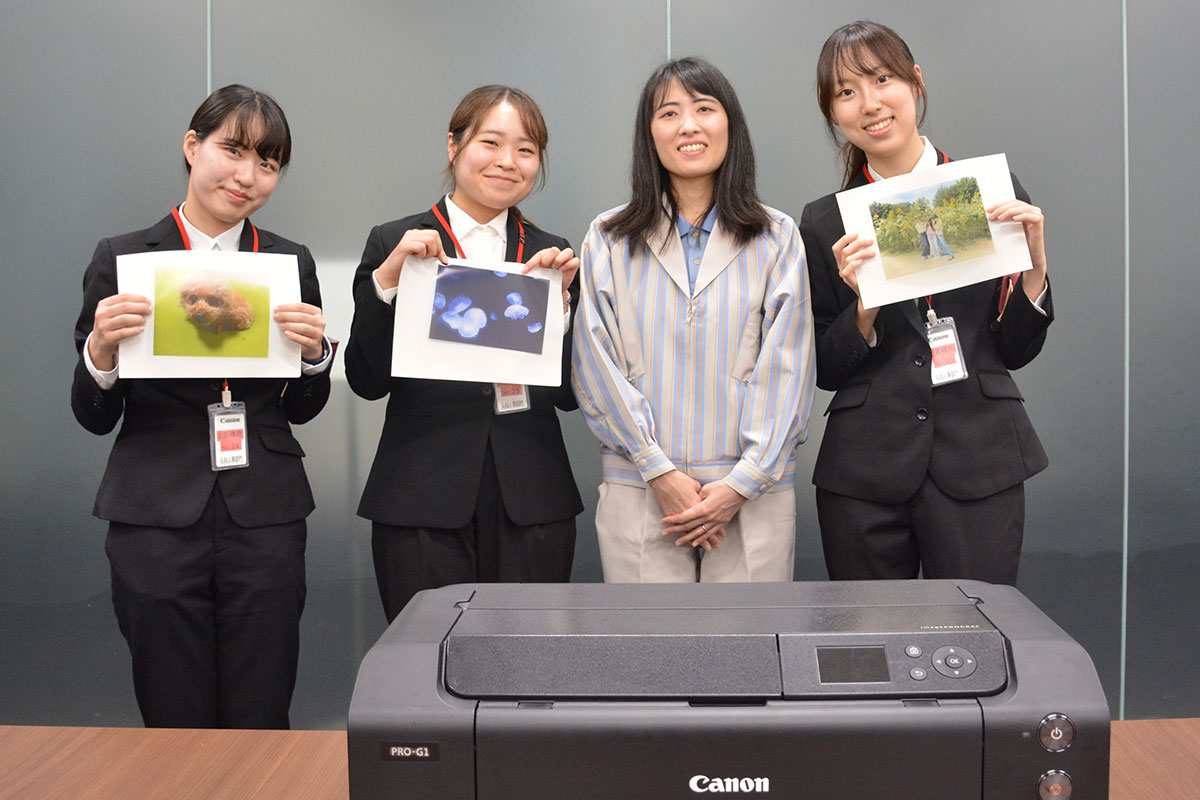 吉川さん:2017年にキヤノン株式会社に入社し、2025年の7月まではプロ用インクジェットプリンターと大判インクジェットプリンターの設計開発を担当していました。プロ用というのは、ハイアマチュアやプロの写真家が使うプリンターです。大判プリンターは卒論発表などで使う大きなポスターを印刷するためのもので、皆さんも目にする機会があるかもしれません。私は、開発の中でも画質関係を担当しており、より美しく印刷するための印字制御という分野の設計をしていました。2025年7月からは異動になり、現在はインクジェットプリンター全体の市場状況や競合他社の動向を分析して、次の製品の仕様を提案する仕事をしています。