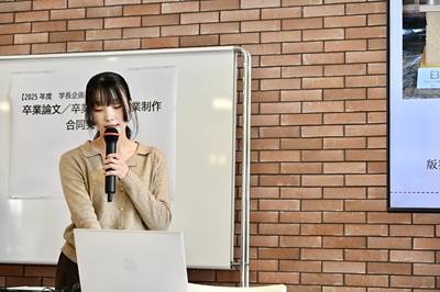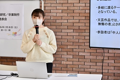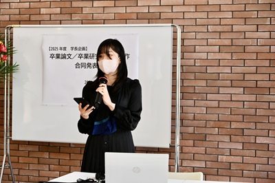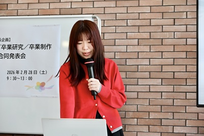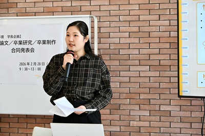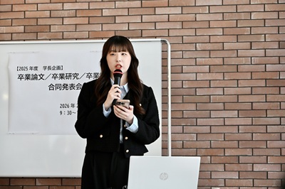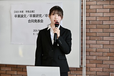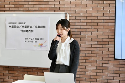 2026年2月6日から10日にかけて各学科で卒業論文発表会が開催され、学生たちはそれぞれの研究成果を披露しました。そして2月28日(土)、学長企画として、7学科から推薦された学生による卒業論文合同発表会が行われました。本発表会は、本学の特色である幅広い学問領域を背景に、人文・社会科学・自然科学・生活科学と、多様な分野の研究が一堂に会する文理融合の場となりました。専門分野の枠を越えて研究成果を共有することで、学生たちは異なる視点や方法論に触れ、学問の広がりと新たな気づきを得る貴重な機会となりました。