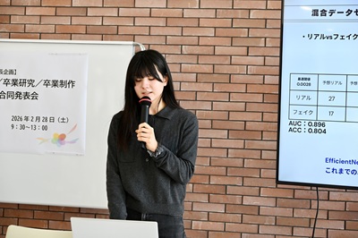 理系の方の発表は私たちと少し異なり、実践的な内容の研究が多いという印象を受けました。中でも生成AIを用いた画像をどのように見分けるかという研究発表(「リアル/フェイク画像の識別手法に関する研究」 数物情報科学科Yさん)は、今の時代に即していて、面白いと感じました。