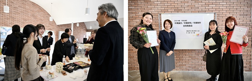 発表後には学生と教職員での懇親会を行いました。互いの研究発表をねぎらいつつも興味を持った発表者に質問を投げかけるなど、学びを通じたコミュニケーションが生まれていました。本合同発表会は、分野を越えて学生たちの研究が交差し、新たな気づきと学びを生み出す場となりました。発表を通して、学生たちが4年間の学びの中で培ってきた探究心と専門性、そして社会へとつながる視点が示されました。本学での学びを礎として、それぞれの道へと進む学生たちの今後の活躍が大いに期待されます。