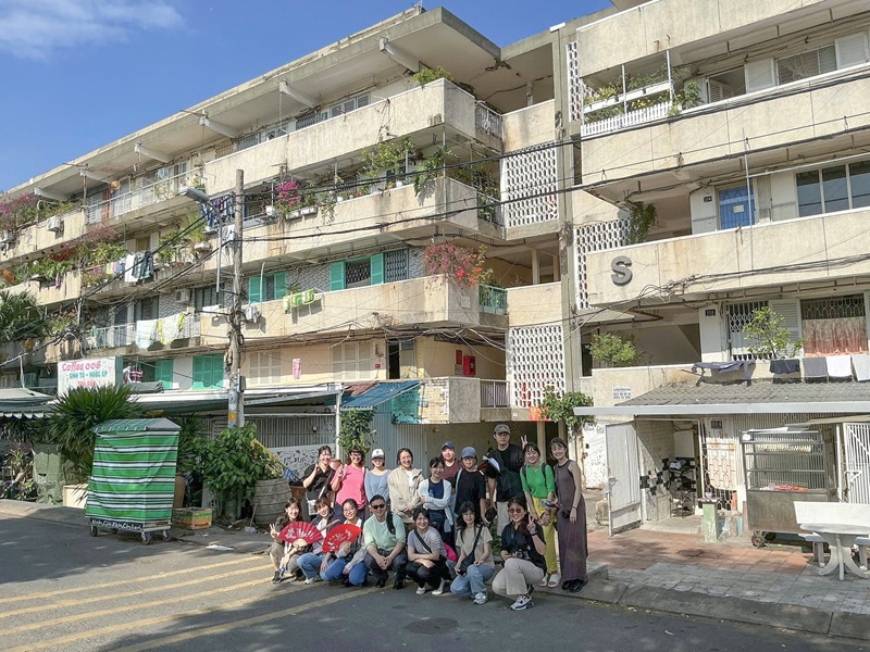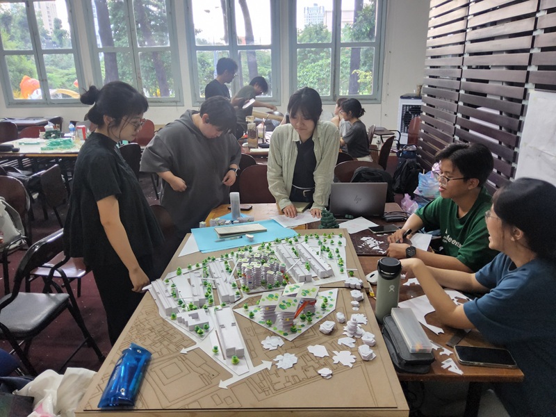 学生たちは日本とベトナム混成の5グループに分かれ、「建築」を共通言語とし、言語の壁を越えて協力しながらホーチミン市内の集合住宅を調査し「自然と暮らす」をテーマに、都市の再開発計画や住戸設計の提案に取り組みました。対象となったのは、再開発が進むホーチミン市内の集合住宅(団地)です。外廊下に鉢植えが置かれていたり、住民が自分たちで増改築していたりと、公共の空間と私的な空間の境界が緩やかに重なり合う特徴的な住環境が広がっています。学生たちはこうした特徴を読み取りながら、空間の構成だけでなく、そこに根付く暮らしやコミュニティのあり方にも目を向けていきました。