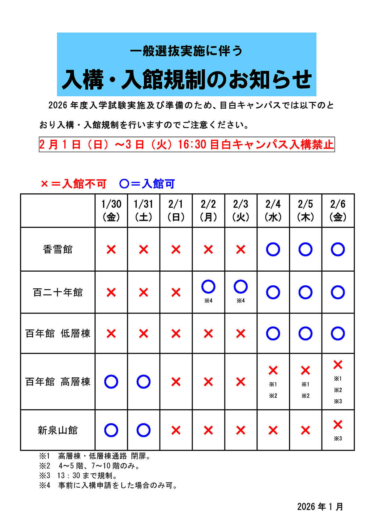 【重要】2026年度一般選抜に伴う入構規制等のお知らせ
