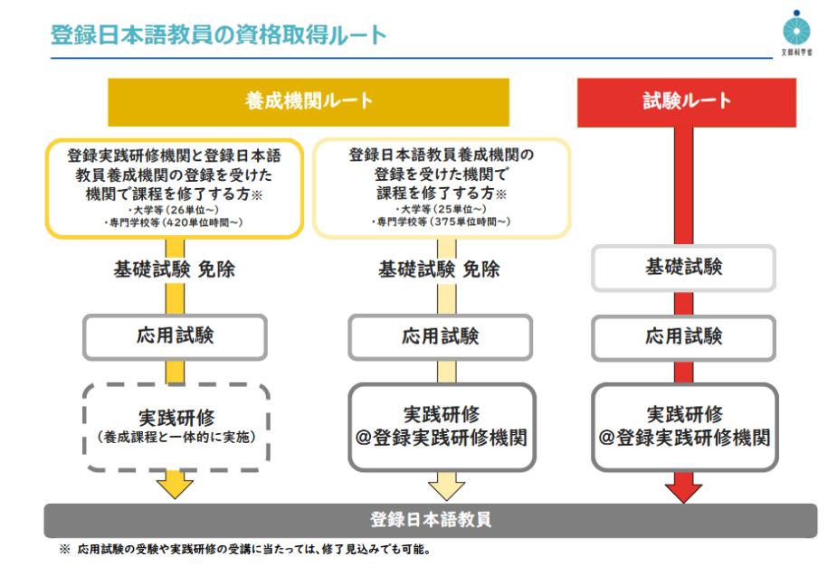 「登録日本語教員」として認定されるためには、「日本語教員試験(基礎試験)」及び「日本語教員試験(応用試験)」に合格し、「実践研修(教育実習)」を修了していることが求められますが、「登録日本語教員養成機関」「登録実践研修機関」が実施する課程を修了すれば、申請により基礎試験の免除を受けることができます。