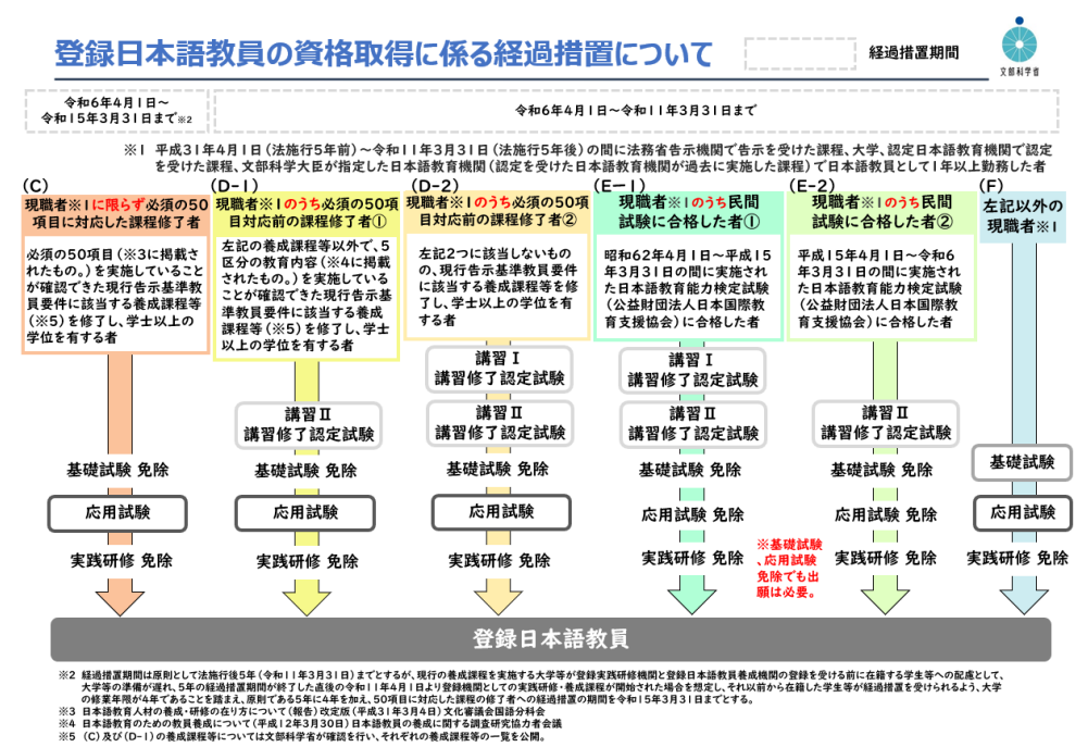 新たな制度への円滑な移行と負担の軽減の観点から、一定の要件を満たす場合には、日本語教員試験や実践研修を免除する経過措置を設けられています。